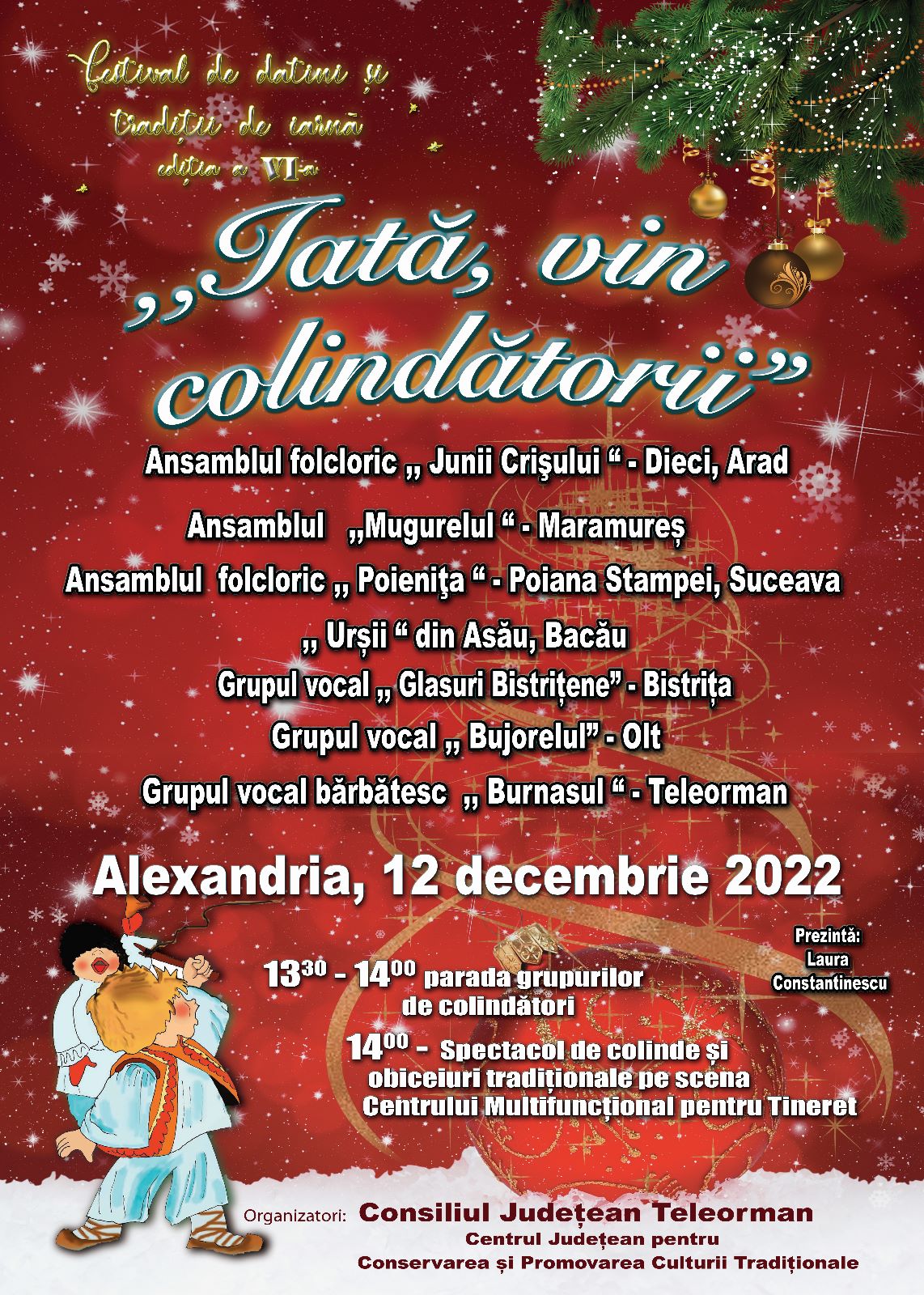 Consiliul Județean Teleorman prin Centrul Judeţean pentru Conservarea şi Promovarea Culturii Tradiţionale Teleorman vă invită să participați la Festivalul național de colinde ,,Iată, vin colindătorii!”, editia VI a, în ziua de 12 decembrie 2022.